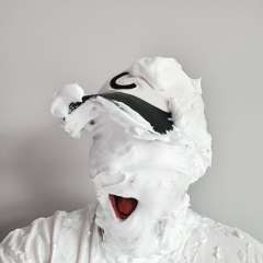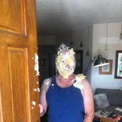 Piestooge was surprised by FormalWAM with a big sloppy cream pie to the face